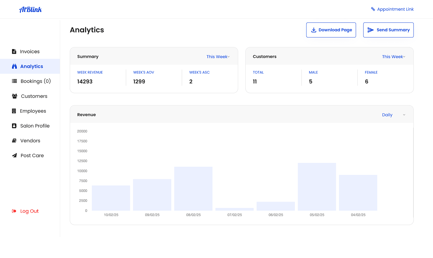 get detailed analytics of your salon performace throught day/month/year